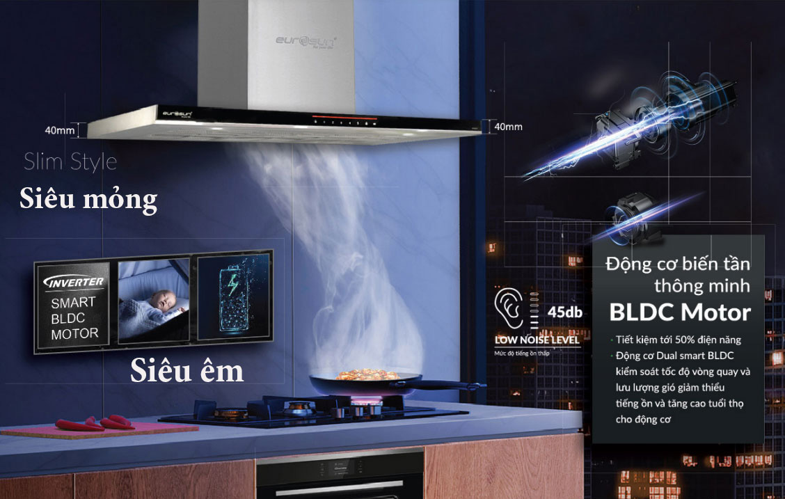 Máy Hút Mùi Eurosun EH-70AF79PRO được trang bị loại động cơ mới nhất, hút khỏe và êm nhất dùng cho máy hút mùi đó là BLDC Inverter Motor. BLDC Inverter Motor không chổi than giúp tiết kiệm trên 50% điện năng và giảm độ ồn trên 40% so với động cơ thường.