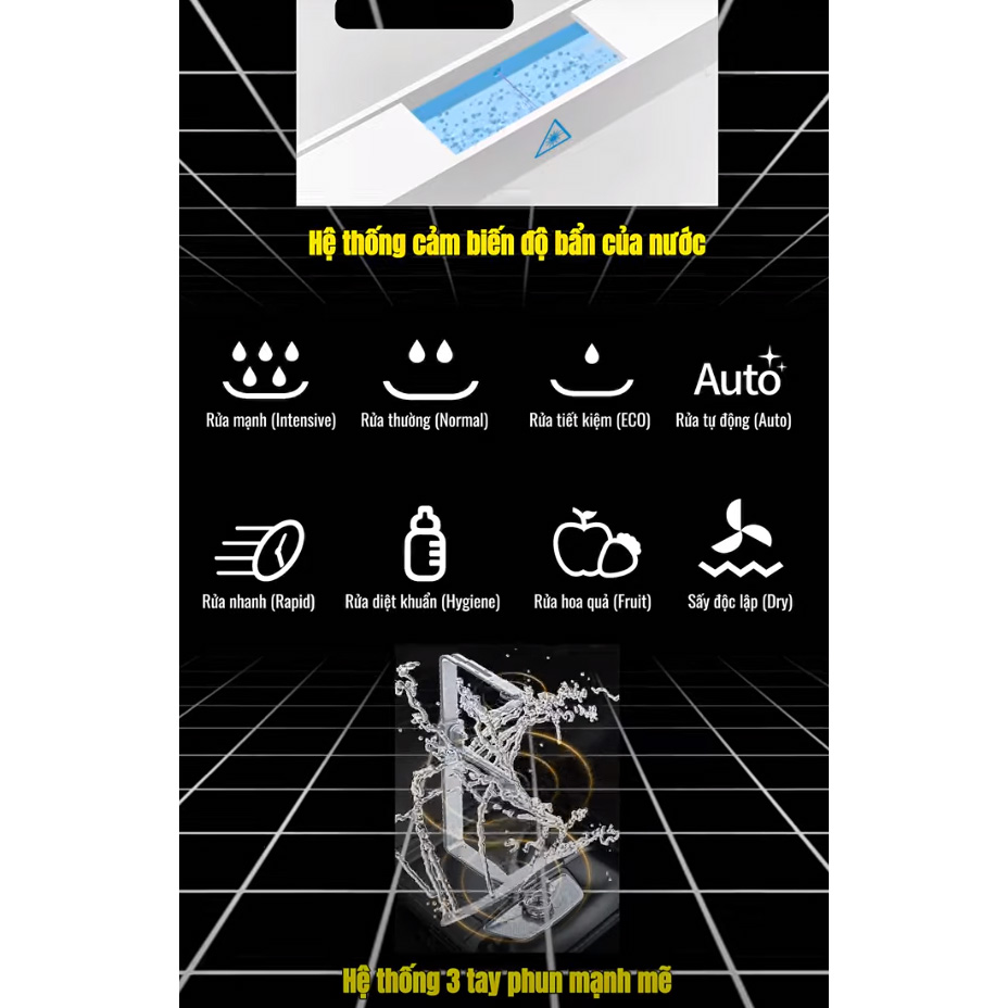 - 8 chương trình rửa tự động + Rửa mạnh chuyên sâu Intensive với đồ bẩn nhiều + Rửa tiết kiệm Eco rửa sạch và tiết kiệm nước tối đa + Rửa thường Normal dùng cho đồ bẩn trung bình + Rửa Auto: tự động cảm biến dựa trên độ đục của nước và tự xác định độ bẩn chén dĩa từ đấy điều chỉnh nhiệt độ và thời gian phù hợp + Rửa nhanh Rapid: Rút ngắn thời gian tối đa + Rửa Baby care ( hygiene) tiệt trùng: Tăng cường diệt khuẩn với đồ trẻ em + Rửa Fruit: Rửa rau củ quả loại bỏ hóa chất, thuốc trừ sâu + Sấy độc lập - Chức năng tăng cường: + Chức năng Sấy PTC Hot Air sấy khí nóng sấy khô hoàn toàn +Chức năng Fress & Drying 168h sấy tươi bằng khí nóng bảo quản vô trùng lên đến 7 ngày liên tục. + Chức năng Eco Wash” Half Load” rửa nửa tải khay trên/ khay dưới, tiết kiệm với việc chọn rửa giàn trên dưới. + Chức năng khử trùng bằng tia cực tím UV (internal UV light) - Chức năng an toàn: + Hệ Thống An Toàn Đa Lớp Chống Rủi Ro + Khóa trẻ em: Bảo vệ tuyệt đối, ngăn ngừa sự can thiệp của trẻ nhỏ. + Cảnh báo rò rỉ nước: Kịp thời phát hiện và cảnh báo sự cố, tránh hư hại. + Cảnh báo muối/nước bóng: Đảm bảo hiệu quả rửa và sấy luôn đạt mức tối ưu nhất. + Chức Năng Hẹn Giờ Khởi Động Tiện Lợi |